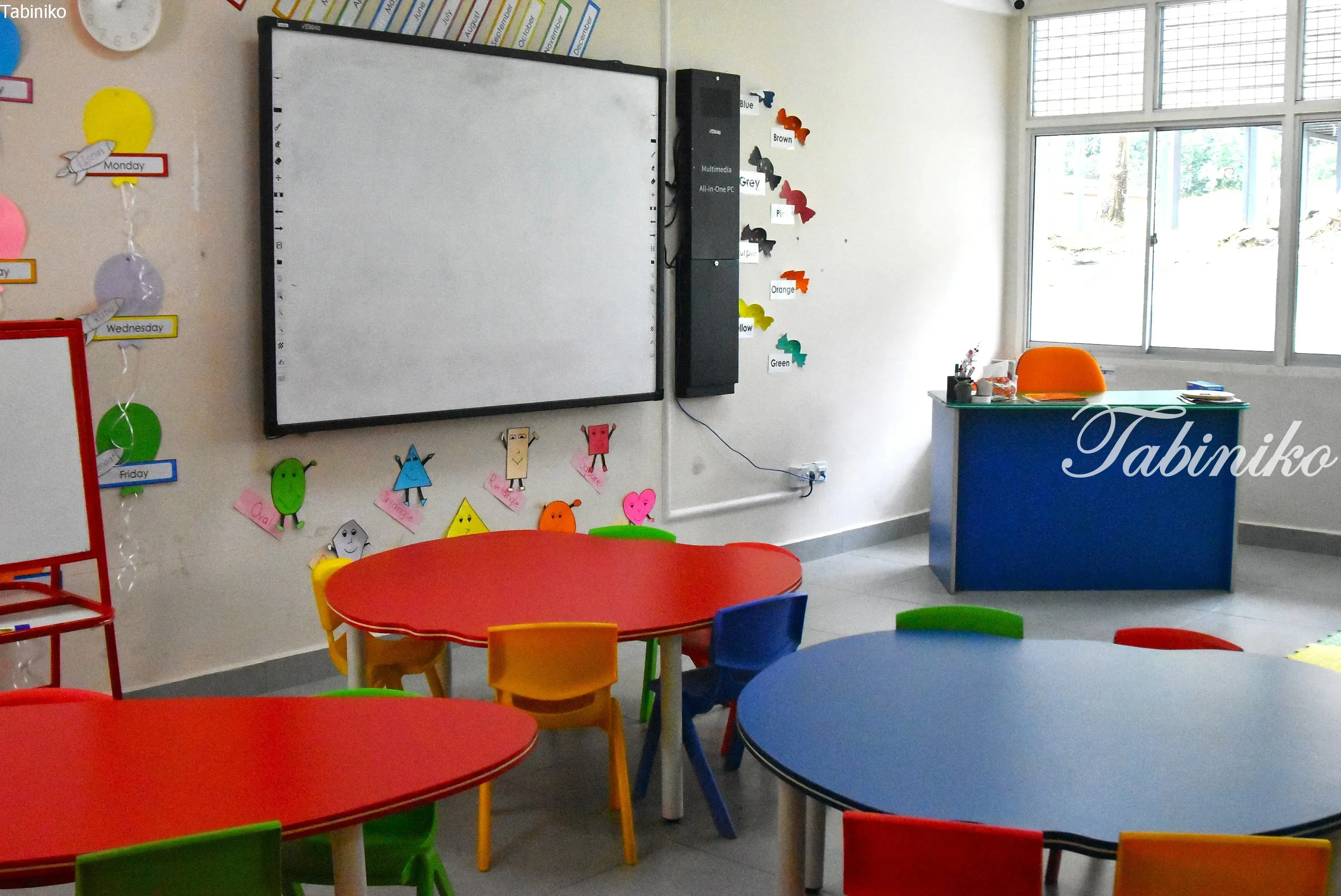 這是一間色彩豐富、可愛的教室。