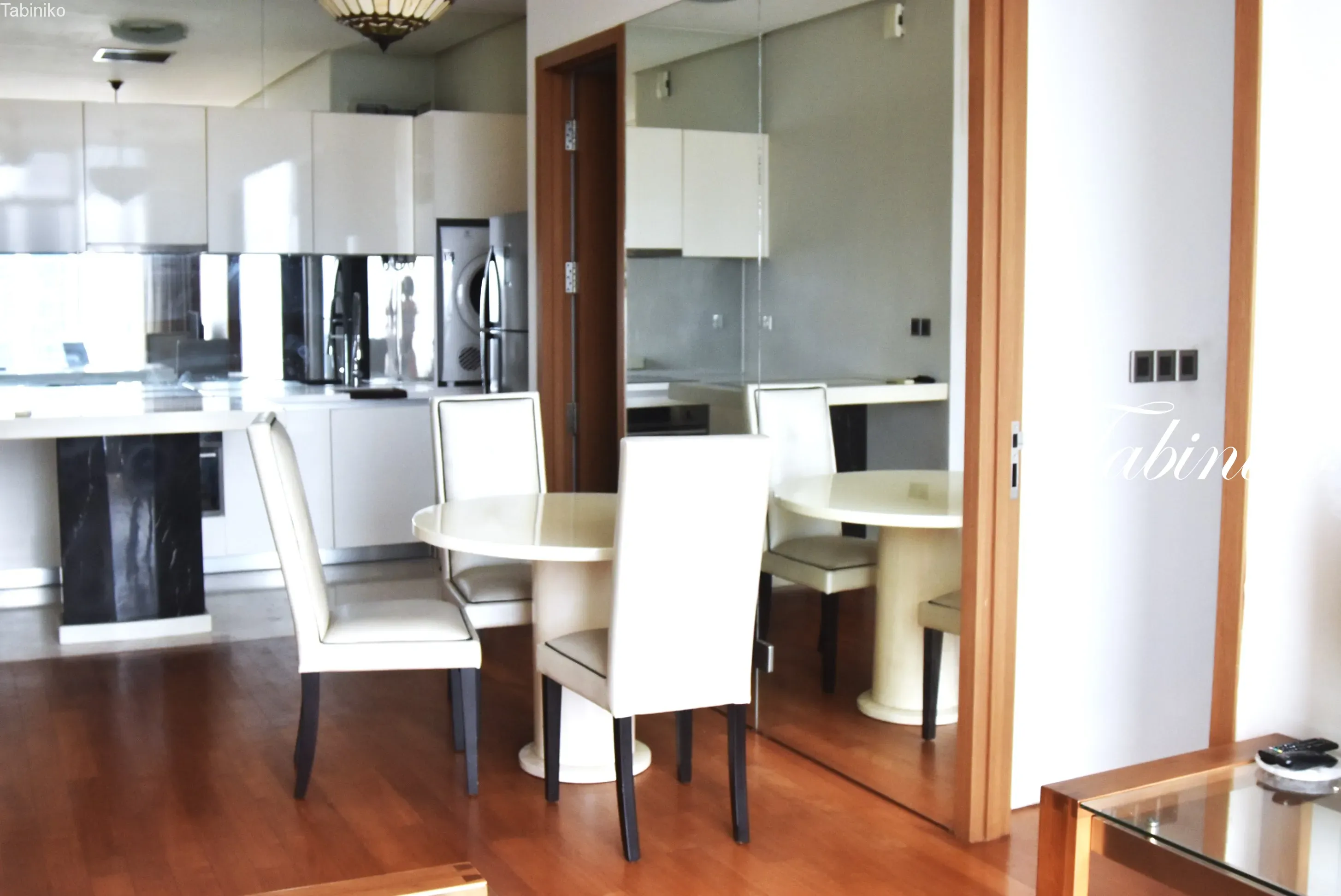 牆上的鏡子使房間看起來空間更大。