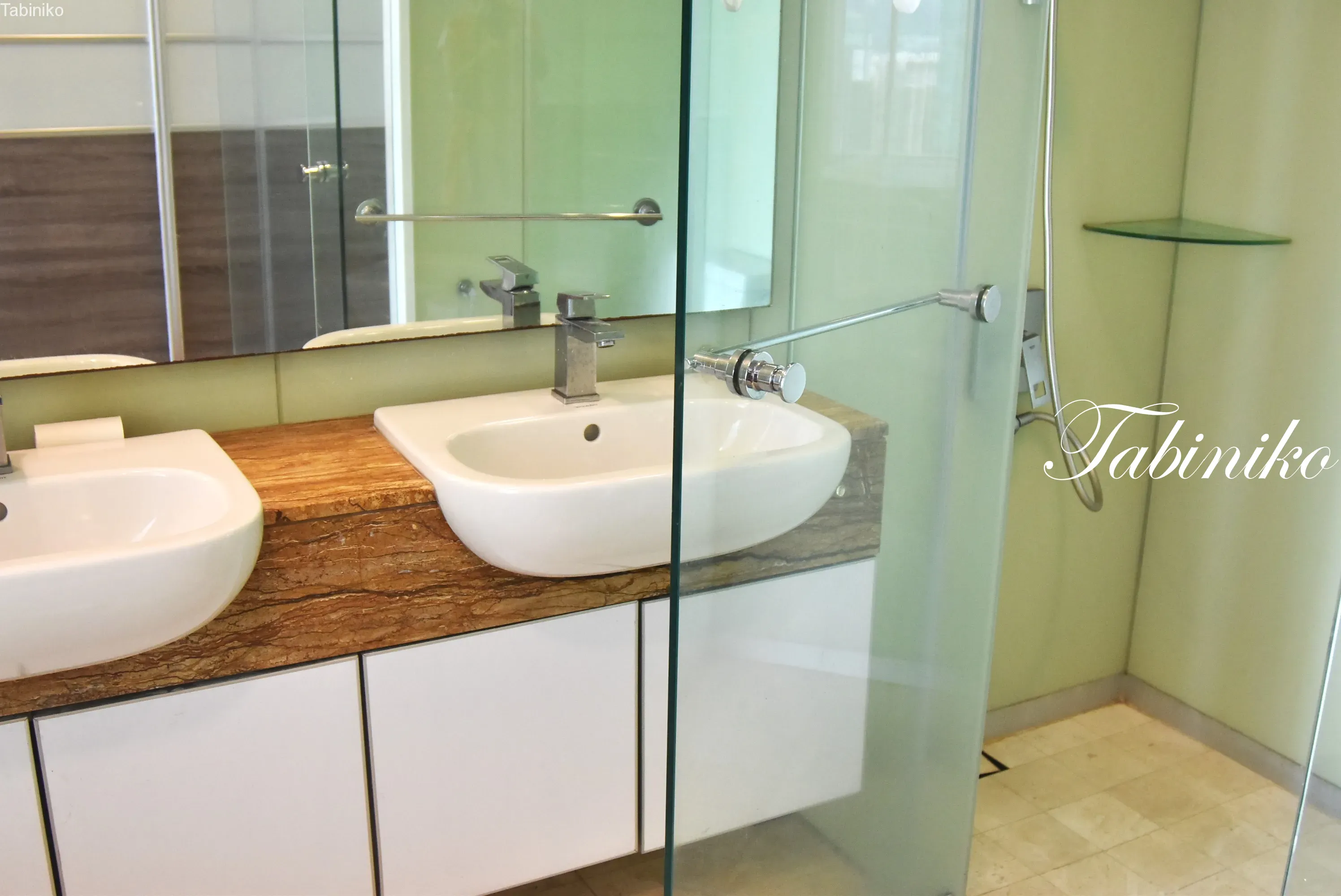 有兩個洗臉盆。右邊是淋浴房。